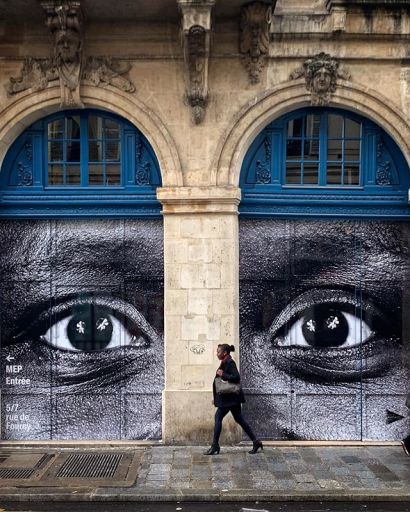 JR is an artist who is known for his projects featuring giant people, faces and eye. This image is in Paris, France.